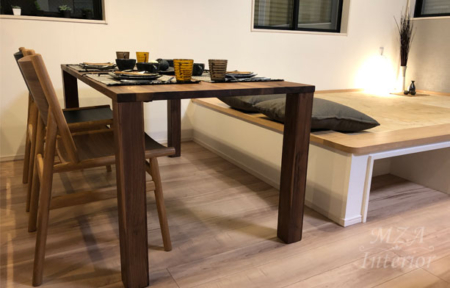 今回のコーディネートではキッチンのアクセントクロス部分の色を統一色とし、それに合わせて家具の張地色や家具の色を選択しています。